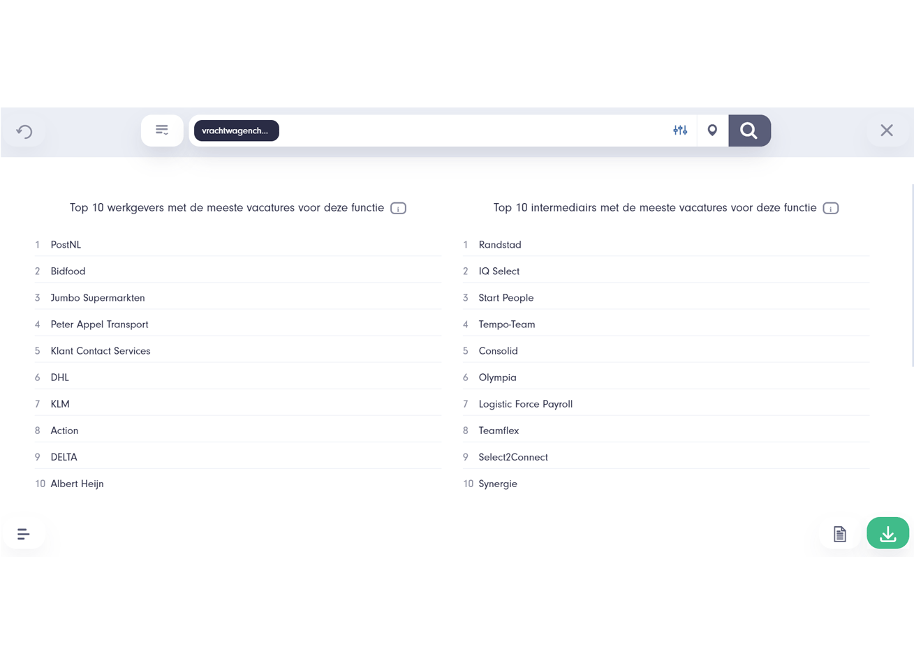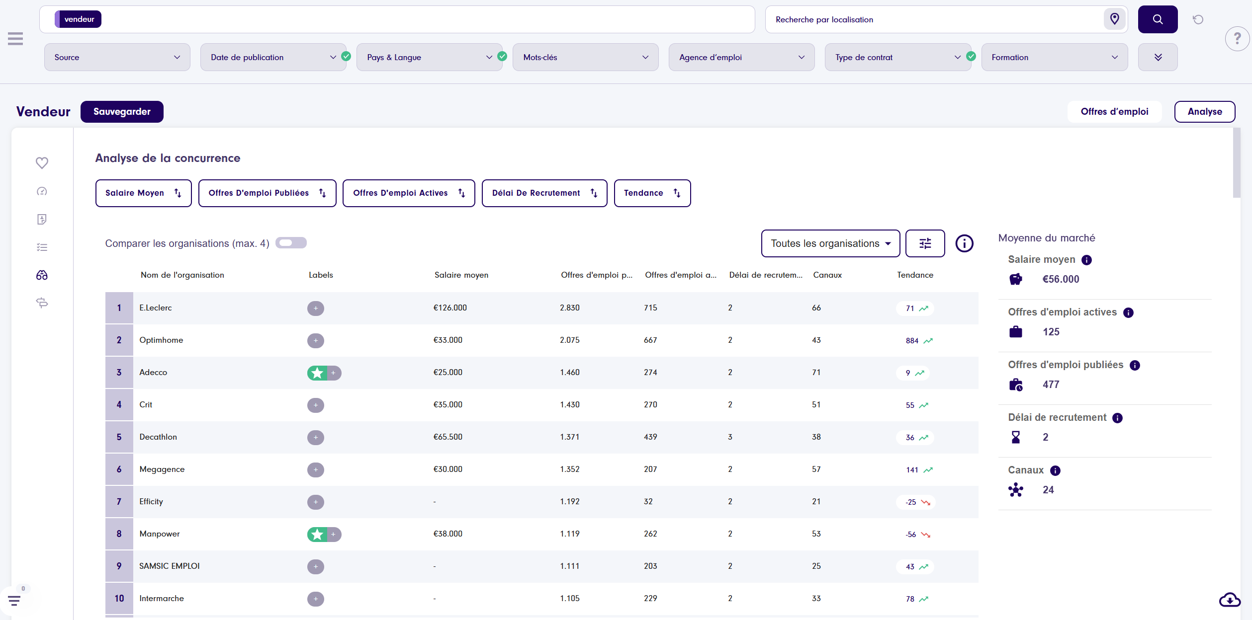Comparez facilement différents employeurs directs et/ou intermédiaires et découvrez les principaux acteurs du marché du travail. Il est important de connaître votre position sur le marché du travail afin de pouvoir effectuer efficacement un benchmarking par rapport aux concurrents, détecter plus rapidement les tendances dans votre segment de marché et mieux saisir les opportunités commerciales et de recrutement ou prendre des décisions stratégiques.