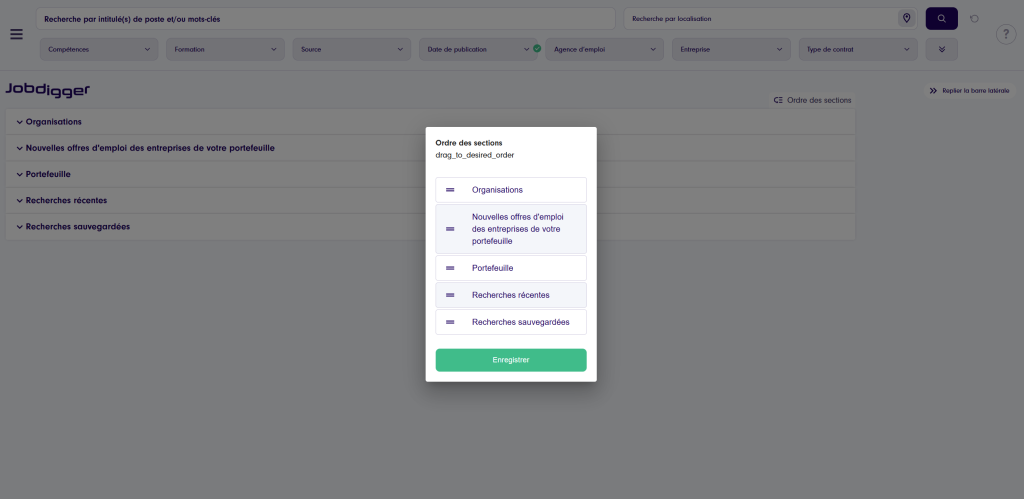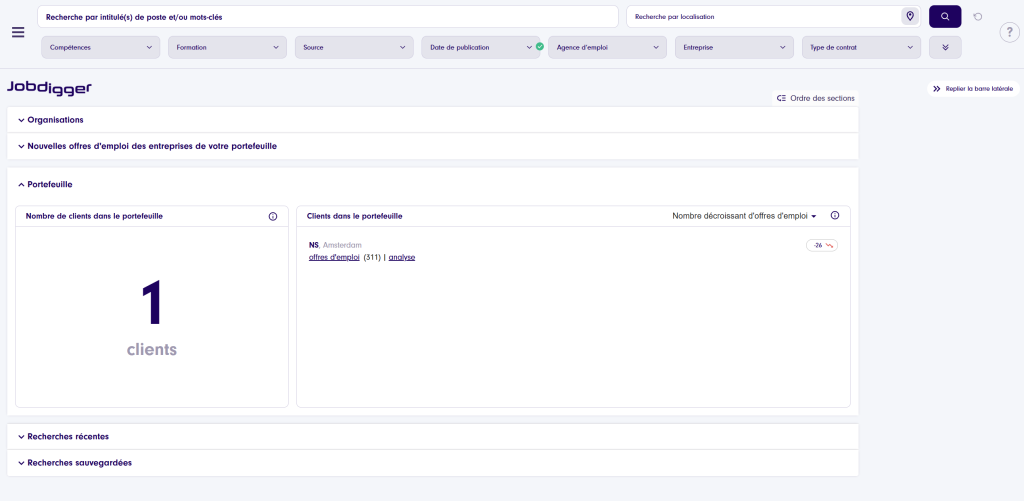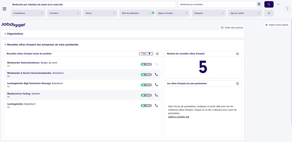 Offres d’emploi : cette section affiche les offres d’emploi qui correspondent aux critères définis dans votre portefeuille. Le bouton « Filtrer » vous permet de filtrer les résultats selon différents critères, tels que le client ou le prospect. Vous pouvez également choisir d’afficher les offres d’emploi les plus pertinentes en activant un profil ciblé. Portfolio : avez-vous des clients dans votre portfolio ? Vous les retrouverez désormais également sur la page d’accueil. Vous voyez immédiatement toutes les offres d’emploi disponibles chez ce client et vous avez la possibilité d’effectuer une analyse de l’entreprise.