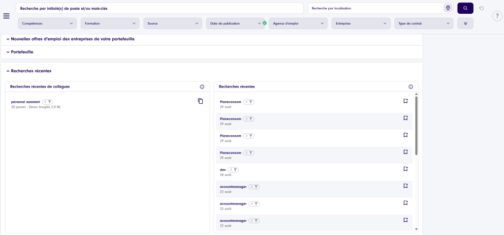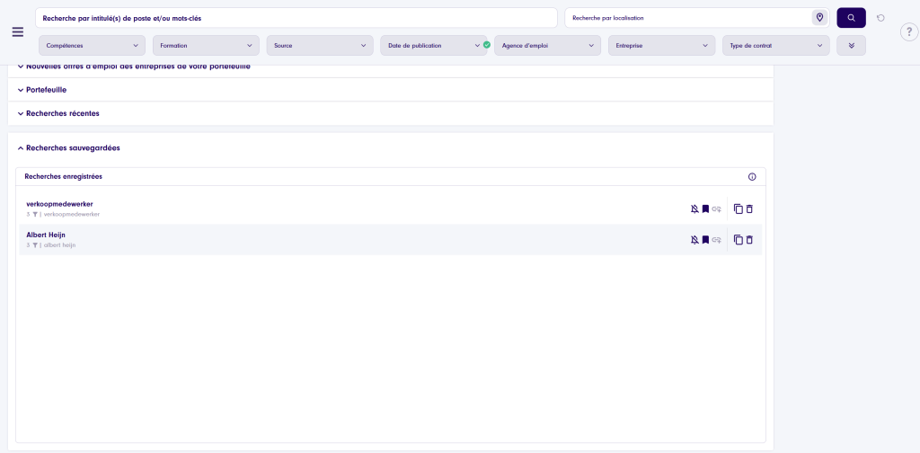 Recherches récentes : sur la page d’accueil, vous trouverez vos recherches récentes clairement classées. À partir de là, vous pouvez facilement les enregistrer comme nouvelle recherche. Il est également possible de consulter les recherches récentes de vos collègues.Recherches enregistrées : avez-vous enregistré des recherches ? Vous les retrouverez sur votre page d’accueil. Vous pouvez activer ou désactiver les notifications, modifier la recherche ou en faire une copie.